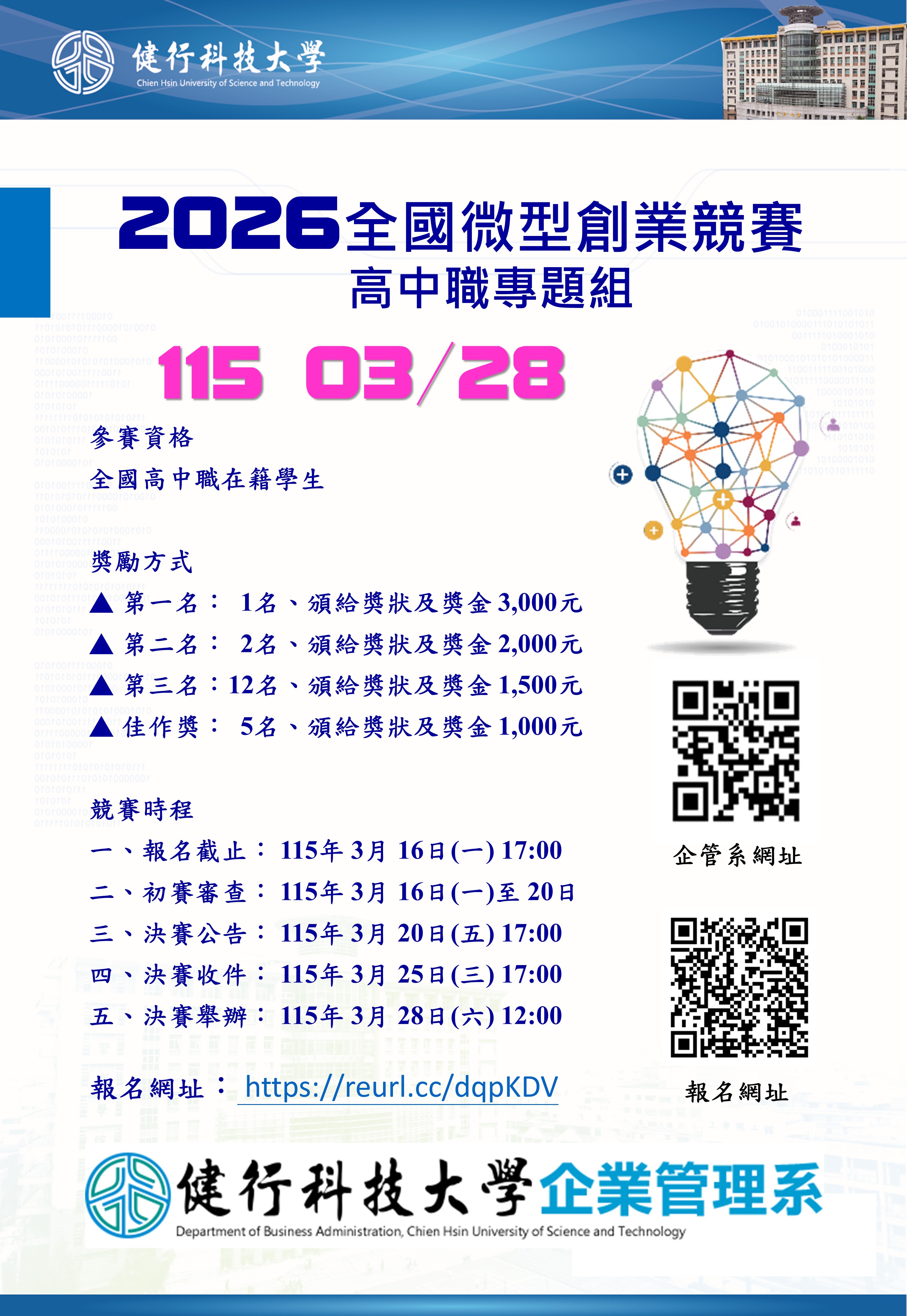 <竞赛>2026 全国微型创业竞赛 高中职专题组,初赛截止2026/3/16 2026-01-06 陈 柏寿 2026 全国微型创业竞赛 高中职专题组 简章 海报 初赛成绩 决赛入围名单 决赛报告顺序 决赛议程 决赛名次 Tweet 打印本页