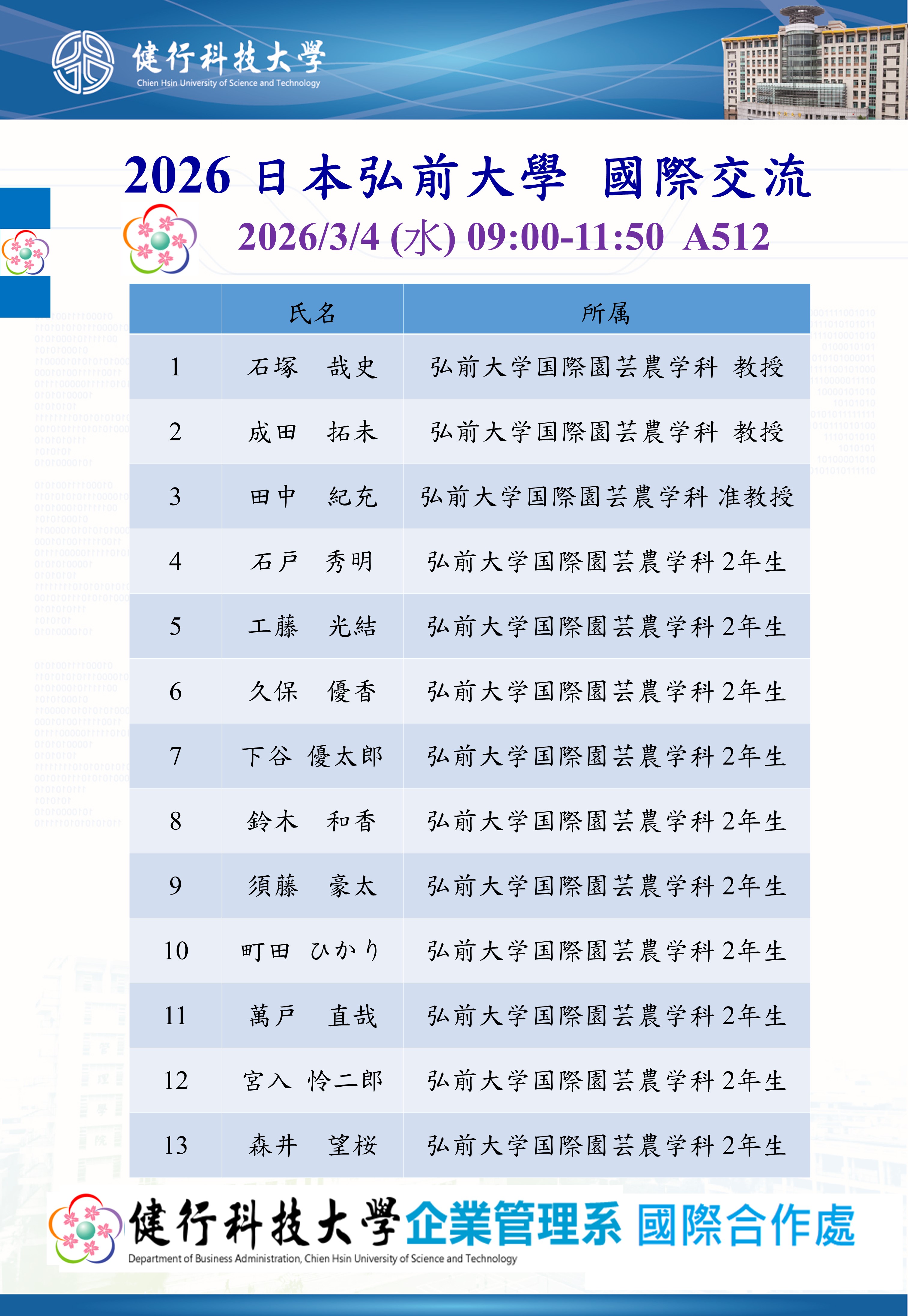<國際交流>日本國立弘前大學國際交流與演講活動2026/3/4 2026-03-09 陳 柏壽 <國際交流> 日本國立弘前大學國際交流與演講活動2026/3/4 【活動說明】 在企管系林玲圓主任、陳柏壽老師等的帶領下,全體師生喜迎來自日本國立弘前大學的13位師生(石塚哉史教授、成田拓未教授、田中紀充准教授等3位教授與10位日本弘前大學大學生),於A512舉行盛大的國際交流與石塚哉史教授演講,在活動中企管系學生使用活潑流暢、簡單易懂的英文與日文熱情歡迎日方師生的來訪,石塚哉史教授進行學術演講。 Tweet 列印本頁